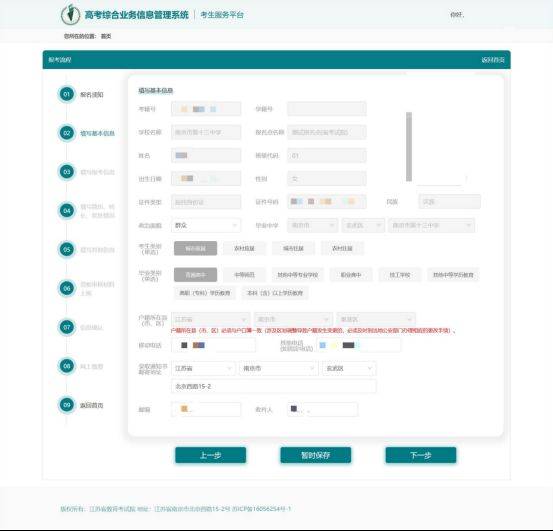 页面置为灰色的输入框不可修改,包括考生的考籍号、报名点、证件号码等信息。其余的输入框需要考生如实填写,考生填写政治面貌、录取通知书邮寄地址、邮编、收件人等信息。点击【下一步】,进入填写报考信息页面。