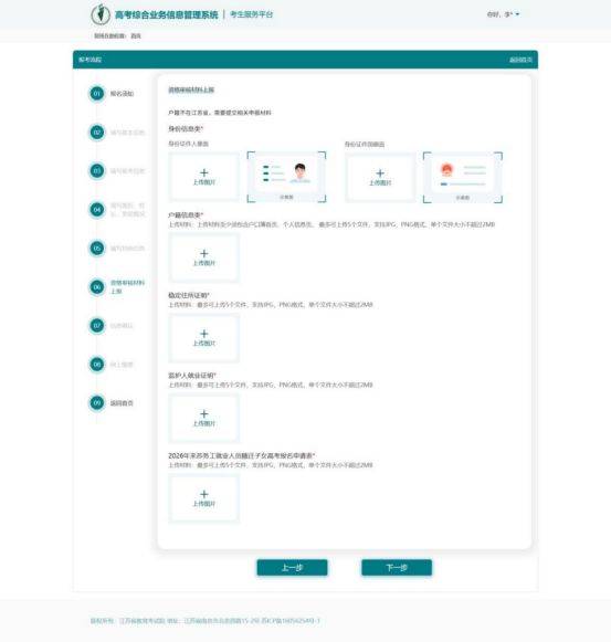 随迁子女需上传相关申报材料,根据系统提示上传身份证件人像面和国徽面,户籍相关材料,稳定住所证明,监护人就业证明和 2026年来苏务工就业人员随迁子女高考报名申请表。