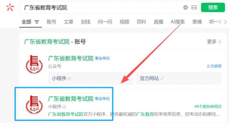 第一步:微信搜索广东省教育考试院,找到广东省教育考试院官方微信小程序