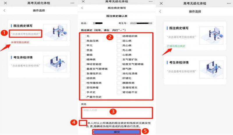 根据实际情况提前填写自身既往病史,并对其真实性负责,如没有既往病史也须填写“无”,没有填写既往病史栏目的不能参加高考体检。考生如需对既往病史进行解释说明的,可将病例、检查报告、出院记录等拍照上传至“无纸化体检考生端”。入学后发现故意隐瞒既往病史者,学校有权按本校招生章程作出处理。