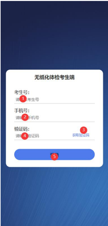 进入无纸化体检考生端登录界面。如下图所示:输入①考生号→输入②考生报名手机号→点击③获取验证码→收到验证码后输入④→点击⑤登录→登录完成。
