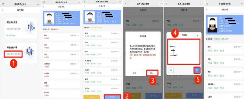 (一) 考生对体检结果无异议。如下图所示:进入考生端→点击①点击查看考生体检详情→点击②签字确认→点击③确认→在签字板④签名→点击⑤确定→该考生体检结束。