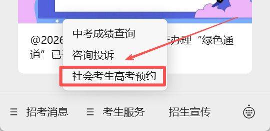 第一步,扫码关注公众号,在菜单栏选择【考生服务】,点击【社会考生高考预约】
