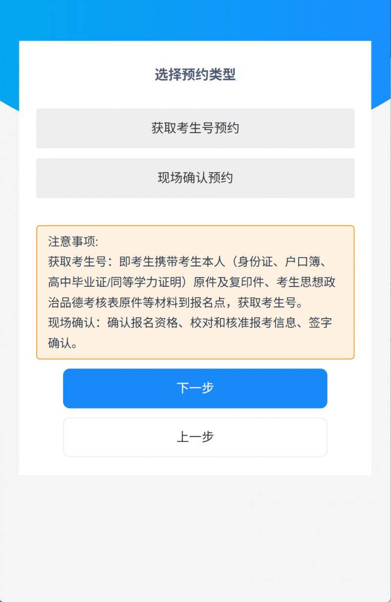第三步,选择预约类型,这里有两个时间点要注意——一个是“获取考生号预约”,时间是2025年11月1日到6日,这个步骤可以让家长帮你代办;