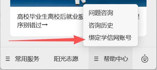 2、在“帮助中心-绑定学信网账号”菜单栏里,点击进入绑定页面,如下图: