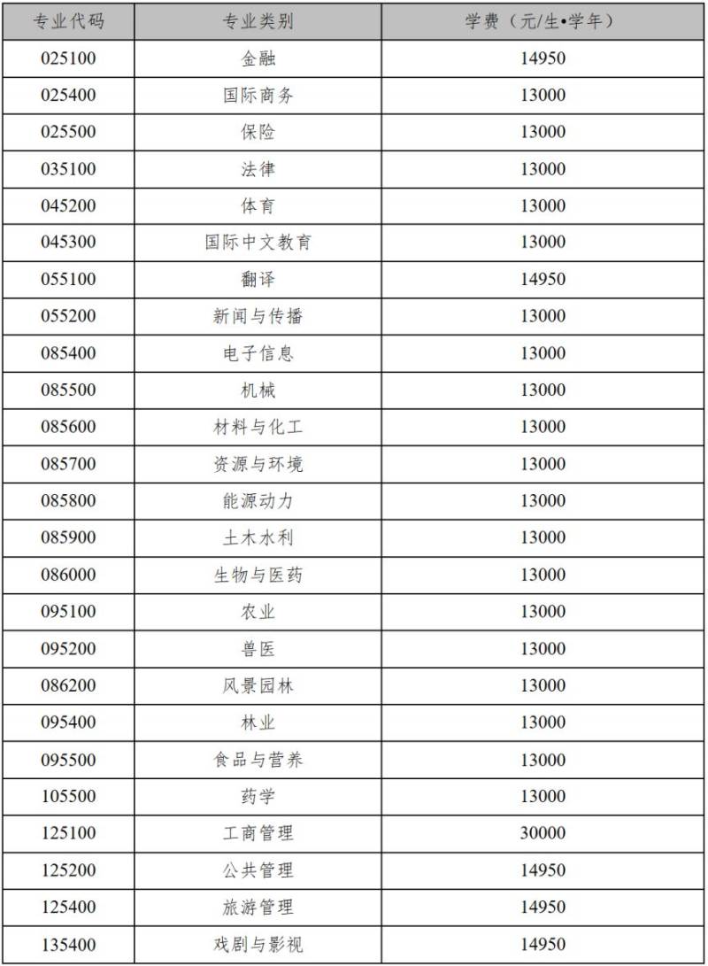 各学科专业按年缴纳学费,缴纳次数为学制年数。具体学费标准如下: