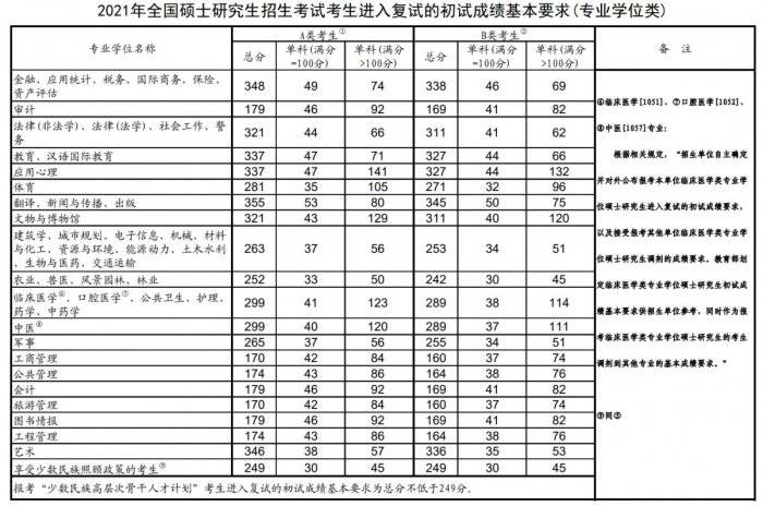 2021年全国硕士研究生招生考试考生进入复试的初试成绩基本要求(国家分数线)