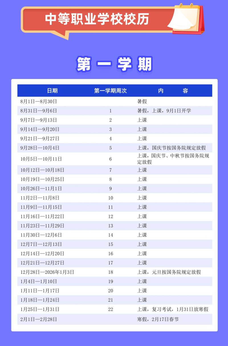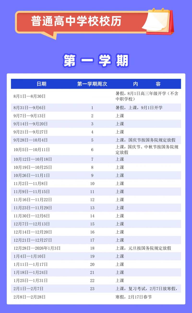 第一学期第1周为2025年8月31日至9月6日:高一、高二年级开学时间为9月1日,普通高中三年级开学时间为8月1日。第二学期第1周为2026年3月1日至3月7日,开学时间为3月2日。