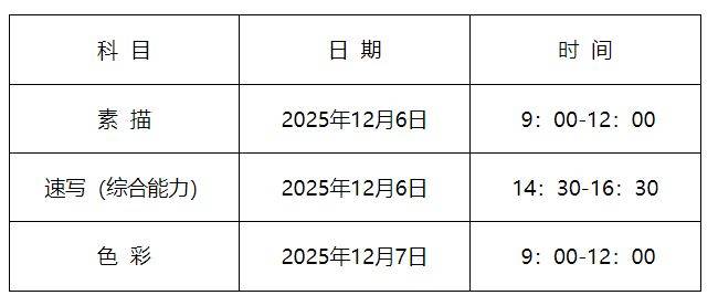 考试时间:2025年12月7日9:00-12:00。其中,书法临摹科目考试时间为9:00-10:30,书法创作科目考试时间为10:30-12:00。
