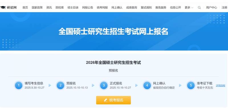 1、登录研招网(网址:https://yz.chsi.com.cn/),点击硕士统考网报,进入报名界面,点击统考报名。