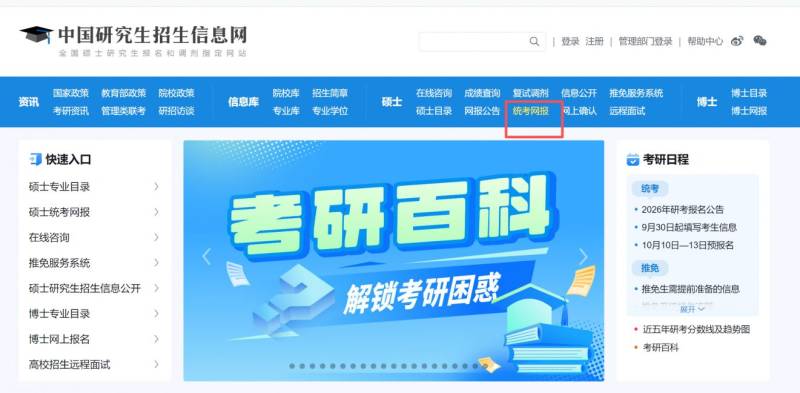 1、登录研招网(网址:https://yz.chsi.com.cn/),点击硕士统考网报,进入报名界面,点击统考报名。