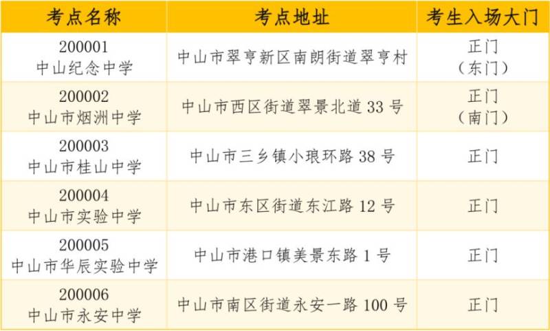 本次考试中山市共设6个考点,请考生注意自己考点的具体名称和地址,防止走错考点影响考试。
