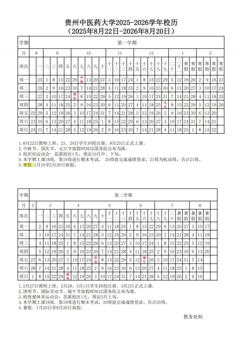 2026年贵州中医药大学寒假放假时间