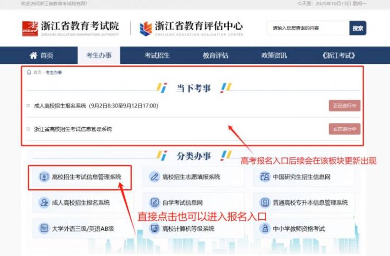 入口1:浙江省教育考试院官网 考生办事(https://www.zjzs.net)