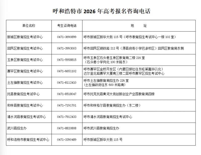 2026年高考报名工作将于2025年10月20日开始,为更好的服务考生和家长,呼和浩特市各旗县区教育招生考试机构面向社会公布咨询电话,如果您在报名时遇到问题,可于2025年10月20日-2025年10月31日(周六日不休息)的工作时间内向报名所在地教育招生考试机构咨询,具体咨询电话如下。