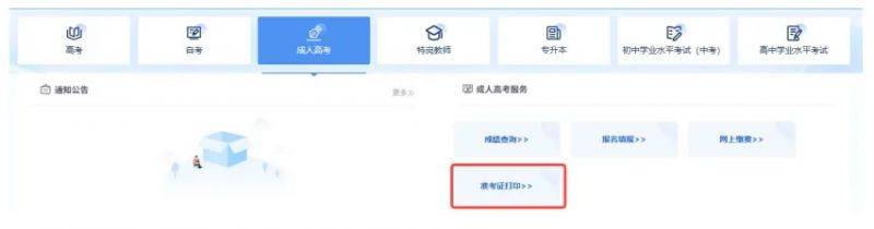方式二:进入平台主页,页面右侧为考生服务大厅快捷入口,点击“准考证打印"进入准考证打印模块。