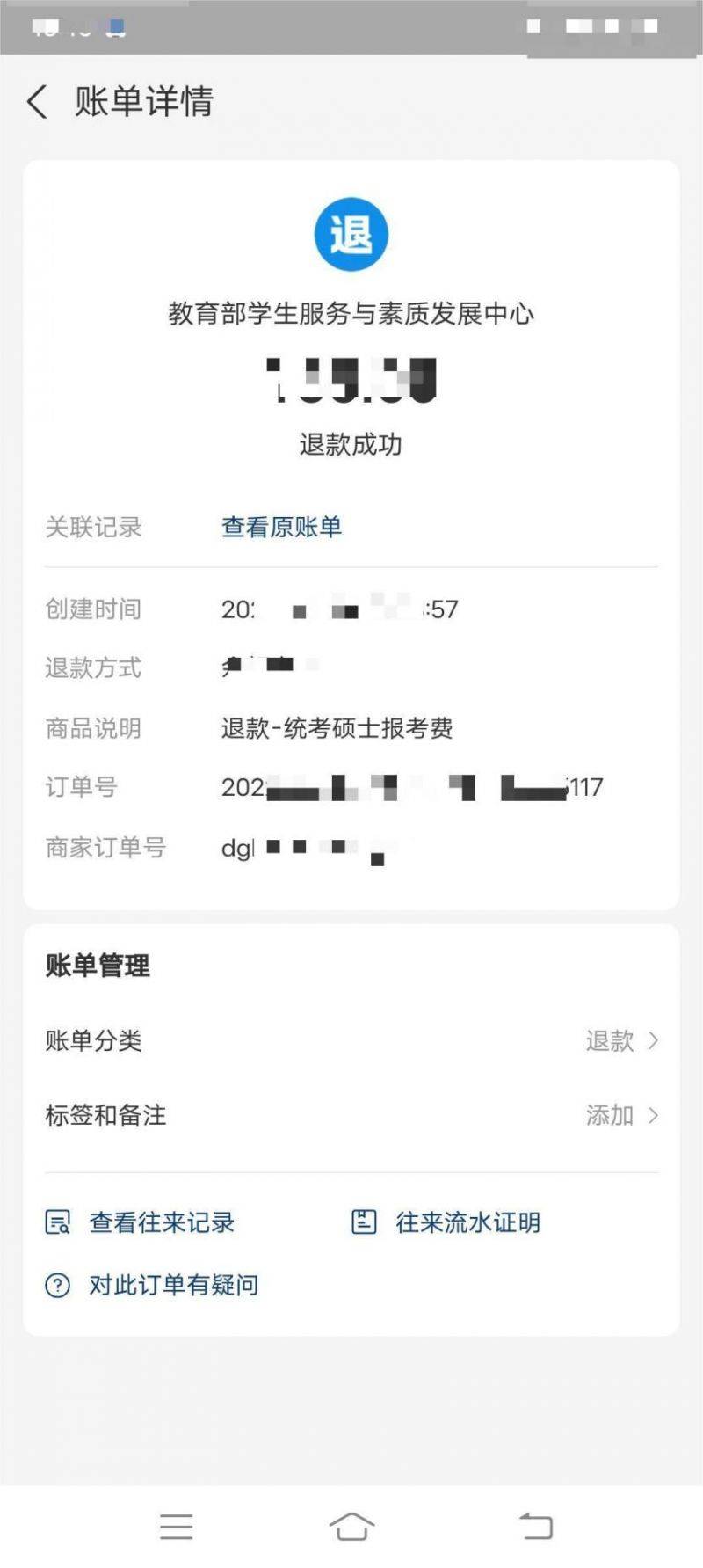 6. 点击“退款-统考硕士报考费”的记录,即可查看更多详情信息。
