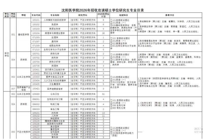 基础医学(1001)、公共卫生与预防医学(1004)、生物学(0710)、公共卫生(1053)、生物与医药(0860)、口腔医学(1052)、护理(1054)、药学(1007)初试业务课科目由我校按一级学科自主命题,考试范围参考本科教学大纲进行命题。详见《沈阳医学院2026年招收攻读硕士学位研究生专业目录》。
