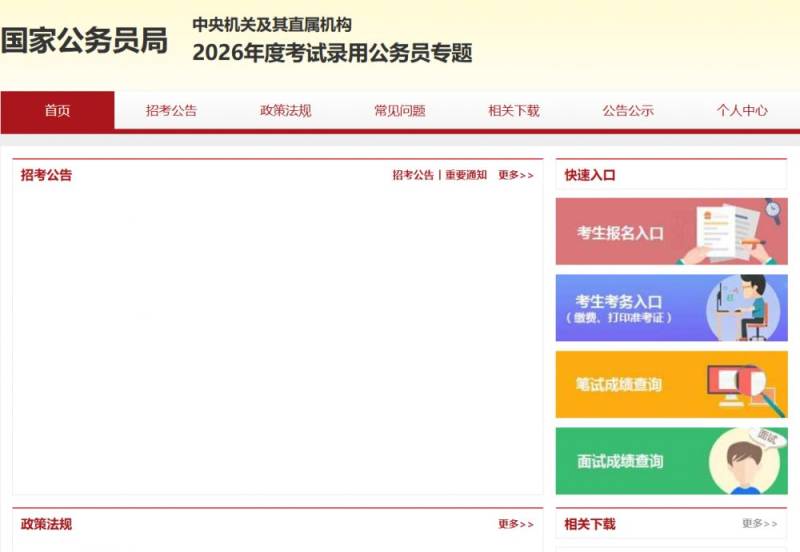 2026年国家公务员考试报名官网入口 中央机关及其直属机构2026年度考试录用公务员专题:http://bm.scs.gov.cn/pp/gkweb/core/web/ui/business/home/gkhome.html 一键直达:北京考试指南