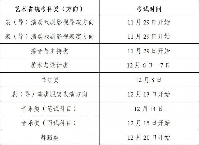 考生须选择相应的省统考科类(方向)(可多选),并同时填选相关信息,完成省统考报考手续。平行志愿批次录取志愿填报时,各科类志愿不能同时兼报,考生只能选择一个科类填报,同一科类内不同方向可兼报。美术与设计类省统考考生在高考报名地所属的设区市参加专业考试。音乐、舞蹈、表(导)演、播音与主持、书法等5类省统考,专业考试在指定考点集中进行。各科类省统考时间如下: