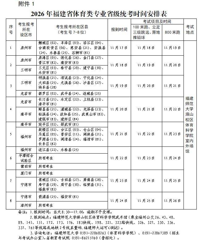 2026年福建省普通高校招生体育类专业省级统一考试(以下简称体育类专业省级统考)定于2025年11月17日-11月26日进行。根据教育部和省招委会有关要求,现就2026年体育类专业省级统考有关事项通知如下。