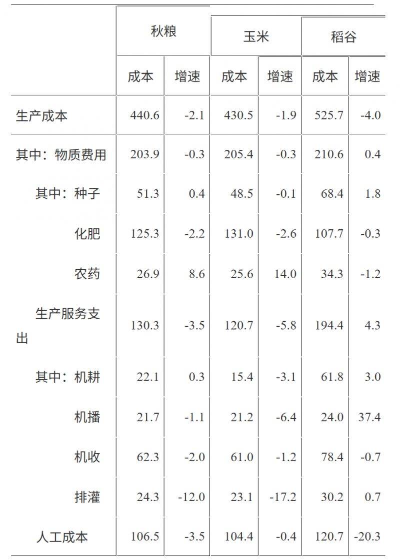 2020年,H省秋粮玉米和稻谷的市场平均交易价格分别为2.34元/公斤和2.74元/公斤,分别比上年上涨28.6%和8.7%。按此价格测算,2020年全省农户种植玉米、稻谷扣除成本前的产值分别为957.1元/亩、1520.7元/亩,分别比上年增长33.4%、8.9%。