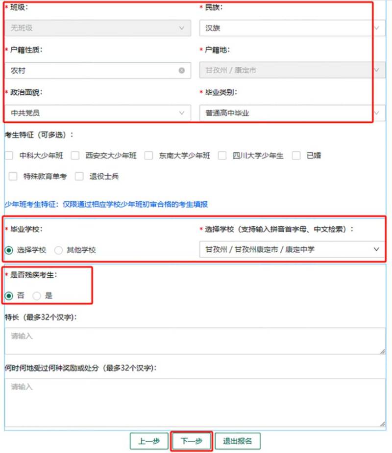 姓名、证件号、区县、报名点等信息已经在系统显示,考生按照报名表要求填写其他信息,包括民族、户籍性质、户籍地、政治面貌、毕业类别、毕业学校、是否残疾考生等。填写完成后点击下一步。