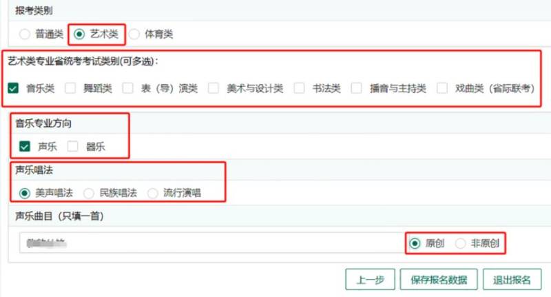 艺术类考生可以根据自己的实际情况,报考类别选择“艺术类”,艺术专业省统考考试类别(可兼报),并根据页面提示完成各类别附加信息的填报,参考界面如下: