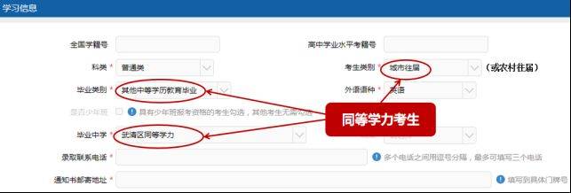 ⑽如报名考生以前具有天津普通高中学籍并参加了天津市普通高中学业水平合格性考试,注册并登录后会显示本人参加普通高中学业水平合格性考试时的相关信息,考生可在此基础上修改。往届生不需要填写全国学籍号和高中学业水平考籍号;同等学力考生不需要填写全国学籍号,须填写普通高中学业水平考籍号。