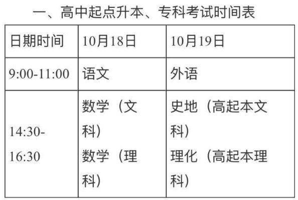 起本、高起专考试按文科、理科分别设置统考科目。公共课统考科目均为语文、数学、外语三门,其中数学分文科类、理科类两种,外语分英语、日语、俄语三个语种,由考生根据报考学校招生专业要求选择一种。报考高起本的考生,除参加三门统考公共课的考试外,还需参加专业基础课的考试,理科类专业基础课为“物理、化学”(简称理化),文科类专业基础课为“历史、地理”(简称史地)。