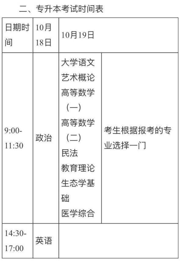 专升本统考科目为政治、英语和一门专业基础课,共3科。专业基础课根据各学科门类的特点设置8个科目。