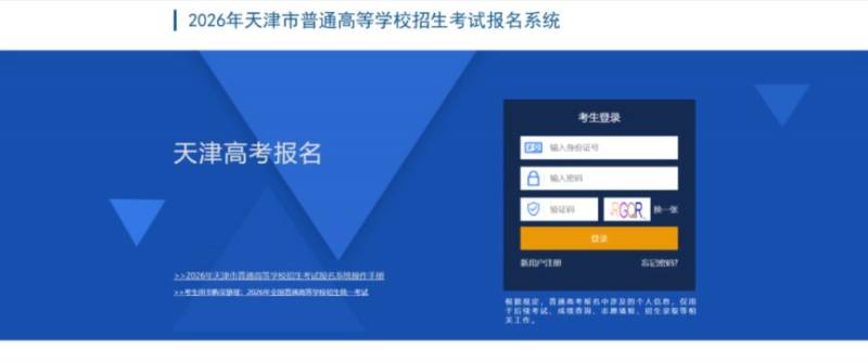 首次登陆报名系统,考生点击“新用户注册”后,按要求依次阅读并了解《国家教育考试违规处理办法(考生部分)》、《市高招办提示》、《天津市普通高等学校招生考试考生诚信报名考试承诺》,注册前须下载《2026年天津高等学校招生网上报名系统操作手册》并按手册进行注册报名操作。