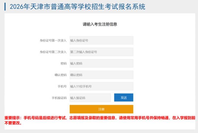 注册时请按照页面说明录入考生本人身份证号(两次录入,身份证号末位为X的需大写)、密码(须牢记)、确认密码、手机号码以及手机验证码,输入完成后,点击“注册”按钮。手机号码和身份证号码在注册完毕之后不可更改,注册过的手机号码和身份证号码不能二次注册。手机号码是后续进行考试、志愿填报及录取的重要信息,务必使用常用手机号,入学报到前,请尽量不作更改,切记!!!