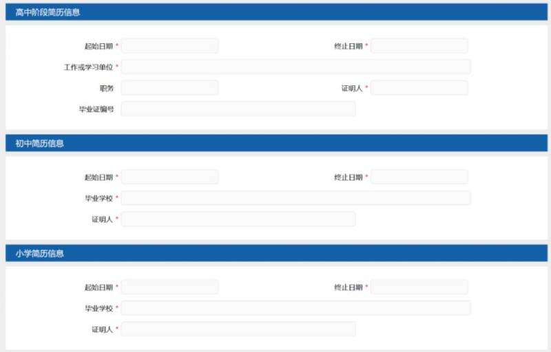 本人简历:高中阶段、初中、小学统一起始日期为:XXXX年9月;终止日期为:XXXX年7月,高中阶段毕业证编号必须如实准确填写。