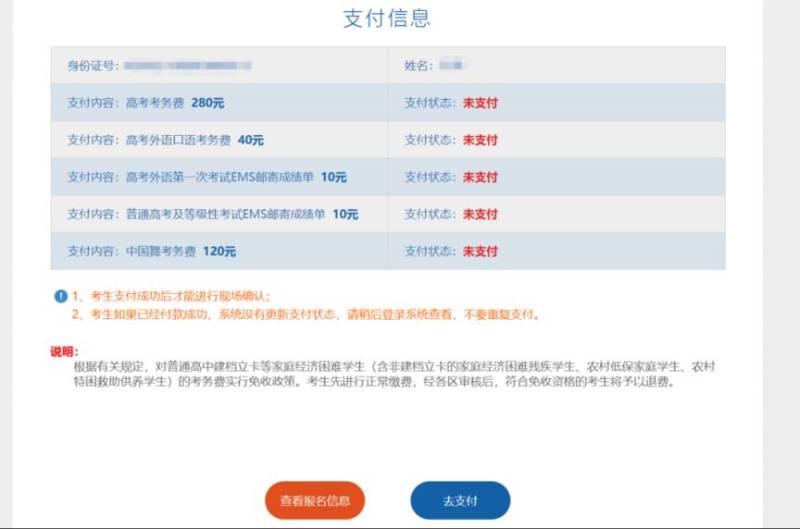 考生可查看报名信息及时修改信息,确认支付信息无误后,点击“去支付”按钮,页面跳转到“天津市教育招生缴费系统”,检查支付金额以及姓名无误后,选择“银行网银缴费”或者“扫码缴费”渠道进行交费。考生支付成功后才能进行现场确认;完成报名信息现场确认的考生,因本人原因不能参加考试的,已进行网上支付的考务费不予退还。考生如果已经付款成功,系统没有更新支付状态,请稍后登录系统查看,不要重复支付。