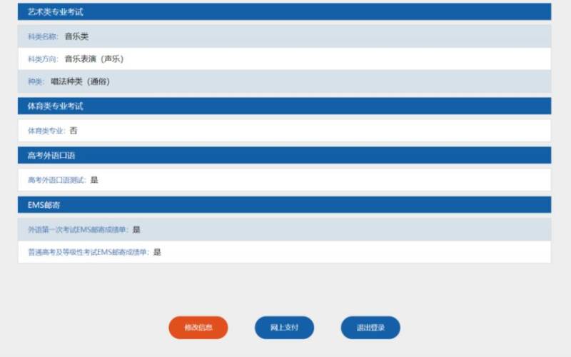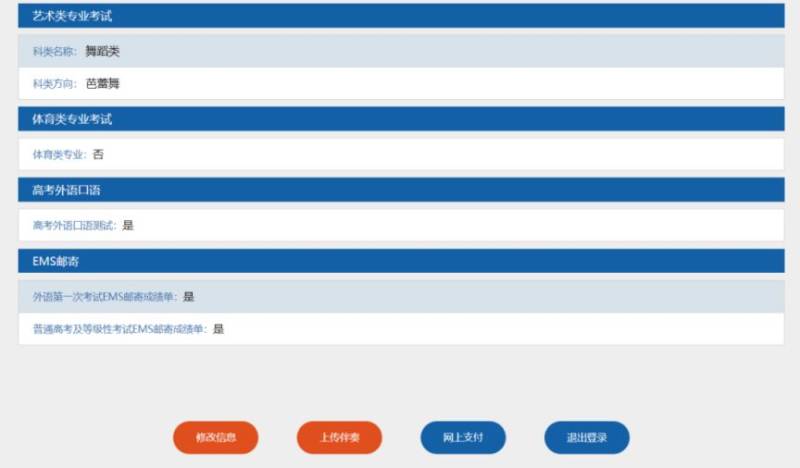 信息确认页面下方有“修改信息”和“网页支付”按钮,可完成修改考生信息和网页支付操作。