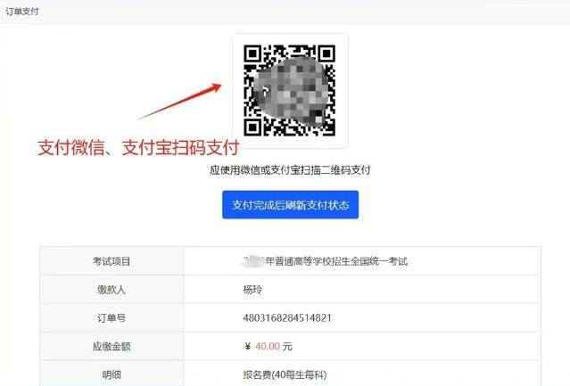 考生确认高考报名费缴费信息,点击【报名缴费】按钮进行缴费。(注意:已成功支付报名费可点击【支付状态刷新】按钮刷新,无需重复支付)
