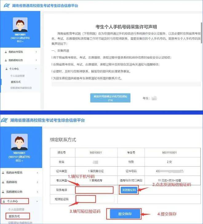 点击功能菜单栏【个人中心】-【联系方式】后,仔细阅读考生个人手机号码采集许可声明,如果同意采集,点击【阅读并同意】进行手机号码绑定,进入手机后面绑定页面后,输入手机号码,并填写接收到的短信验证码,点击【提交保存】完成绑定手机号码操作。注意:往届考生填写报名信息之前,艺术类、体育类专业考试报名之前,必须填写考生本人或能联系到考生的手机号码。