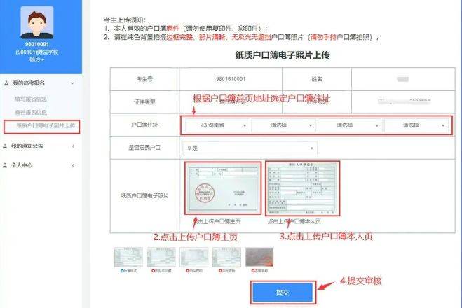 填写报名信息后,访问【我的高考报名】-【上传户口簿照片】,分别上传户口簿首页与本人页,选定户口簿首页住址信息(选定到街道乡镇一级),(点击上传,等待管理端审核,审核通过后即完成了户口照片上传。