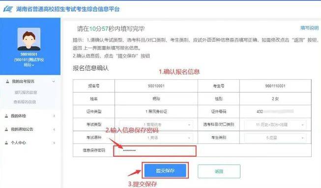 确认填写报名信息无误后,输入信息保存密码后,点击【提交保存】按钮后,提示保存成功后完成报名信息填写。(注意:高考报名期间,考生可随时登录系统修改本人信息,逾期不能再做修改)