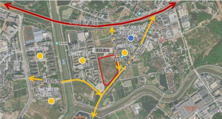 该项目位于横沥镇职教城地块,横沥育才路及水边宝马路交汇处,西侧毗邻东莞职教城,东侧毗邻莞盛小学,北侧为空地,南侧为成熟的商住工业混杂区,周边配套设施较好。地块周边交通便利,除现有横沥育才路、水边宝马路、东部快速干线等城市道路外,还将同步建设规划一路及规划三路,进一步强化交通支撑。
