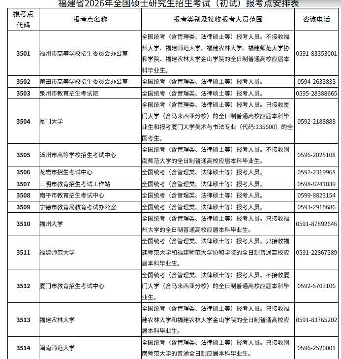我省报考点全部采用网上确认方式,共设14个报考点,包括福州市高等学校招生委员会办公室、莆田市高等学校招生委员会办公室、泉州市教育招生考试院、厦门大学、漳州市高等学校招生考试中心、龙岩市招生考试中心、三明市教育招生考试工作站、南平市教育招生考试中心、宁德市教育局教育考试办公室、福州大学、福建师范大学、厦门市教育招生考试中心、福建农林大学和闽南师范大学等。考生报考类别详见《福建省2026年全国硕士研究生招生考试(初试)报考点安排表》。