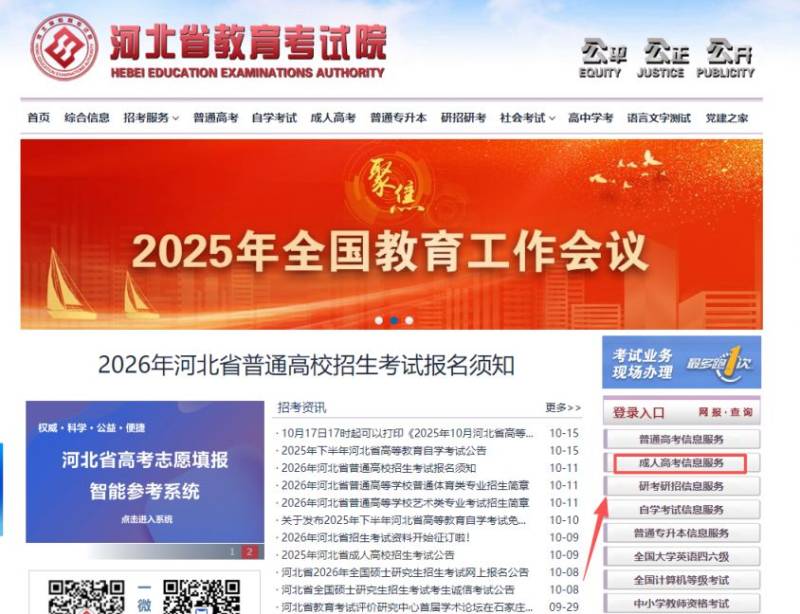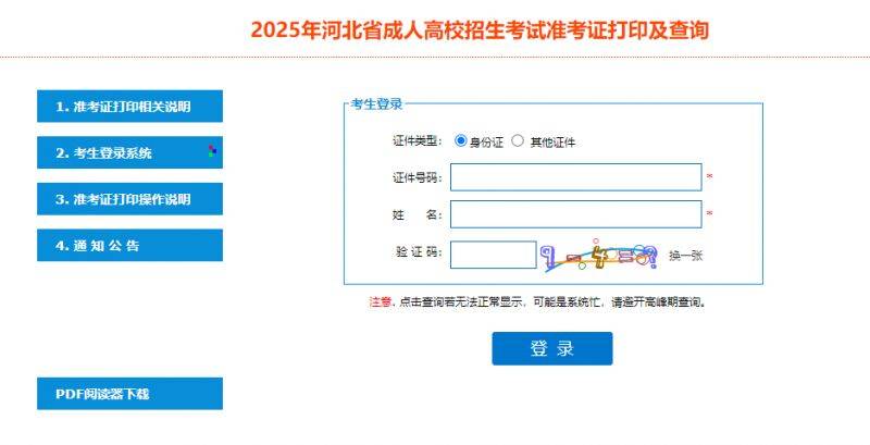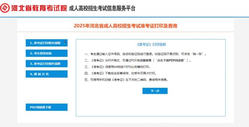 自10月11日9时起,考生可登录河北省教育考试院网站(网址:http://www.hebeea.edu.cn/),点击首页右侧“成人高考信息服务”进入“成人高校招生考试信息服务平台”,选择“准考证打印及查询”,输入身份证件号码和姓名,核对《准考证》信息无误后自行下载、打印《2025年河北省成人高校招生全国统一考试准考证》。