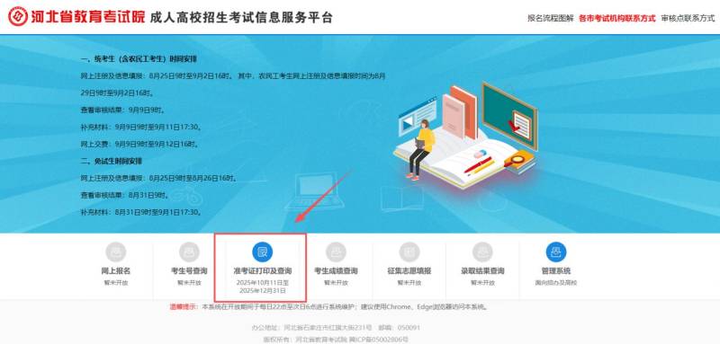 提醒考生注意:为保障考试公平,实行考区内随机编排考场,请准确掌握考试时间、考点地址、考场号、座位号等信息,并认真阅读“重要提示”,严格遵守。《准考证》是考生参加成人高考和入学报到的重要凭证,请妥善保管。建议使用谷歌(Google Chrome)浏览器或Microsoft Edge浏览器、360浏览器(极速模式),使用期间请关闭窗口拦截功能。
