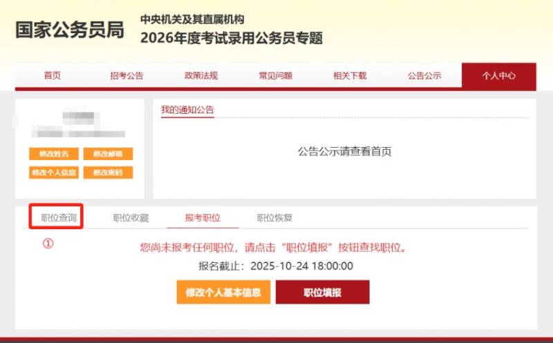 第二步 :进入【个人中心】,完善个人信息,完善后选择【职位查询】