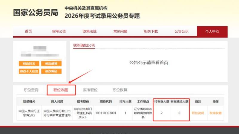 第五步:提示收藏成功之后,返回个人中心,在【职位收藏】中可以看到待审查人数(报名人数)及审查通过人数