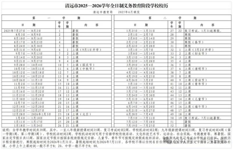 说明:全学年教学时间共39周。其中,一至八年级新授课时间35周,复习考试时间2周,学校机动时间2周;九年级新授课时间33)周,复习考试时间4周(第一学期1周,第二学期3周),学校机动时间2周。各学校不得以任何名目任何形式组织学生在注定节假日,寒暑假集体补课。小学上午上课时间一般不早于8:20,中学一般不早于8:00