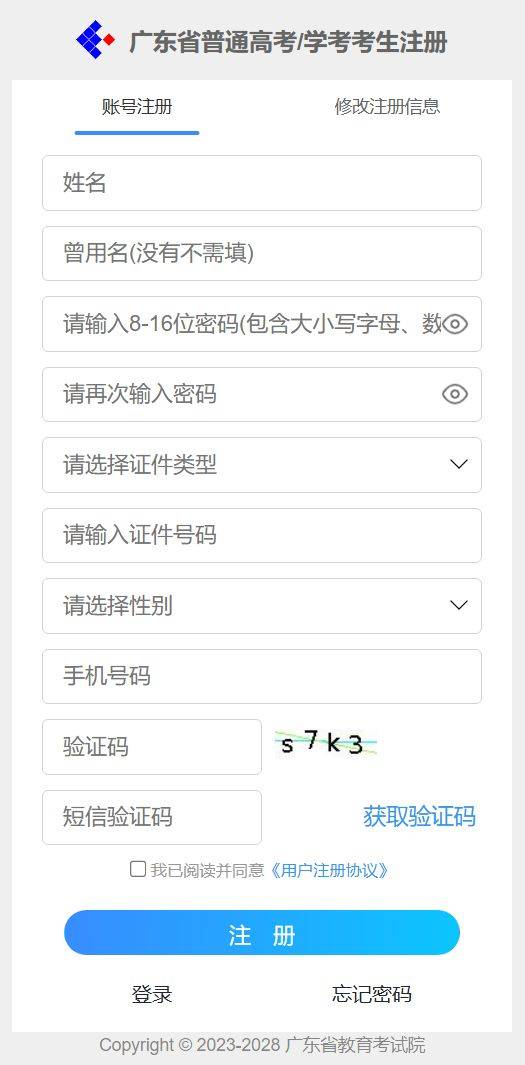 第二步:凭姓名、证件号注册考生账号,设置密码,并绑定手机号,考生应妥善保管本人的系统密码,以便在确认报名资格时修改个人资料、填报志愿、查询考试成绩、查询录取结果等后续环节使用。
