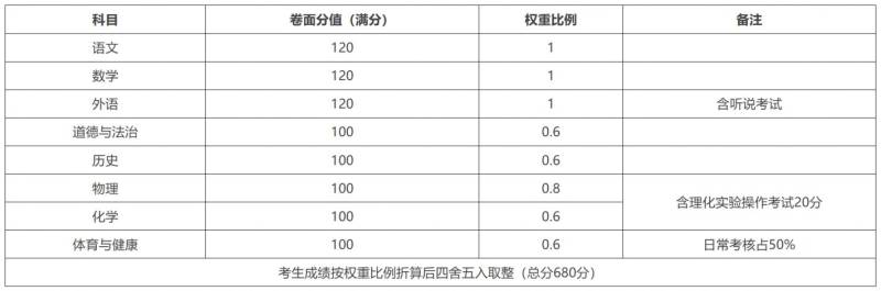 录取计分科目:语文、数学、外语(含听说)、体育与健康、道德与法治、物理、化学、历史等8科,考试成绩分别按不同的权重比例折算后计入学业水平考试成绩。物理、化学的考试成绩由笔试成绩及实验操作考试成绩两部分合成,其中实验操作考试成绩分别占10分。从2026年体育中考开始,降低体育考试部分统一测试科目的难度,增加统一测试的可选择科目。从2028年体育中考开始,将每年体质健康测试成绩纳入中考体育成绩,中考体育成绩的50%由平时成绩构成。
