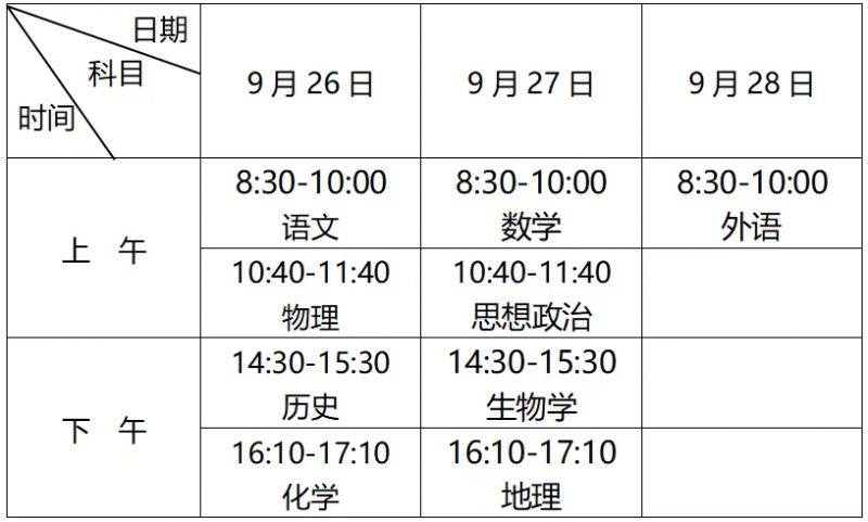 语文、数学、外语考试时长均为90分钟,思想政治、历史、地理、物理、化学、生物学、信息技术和通用技术(合卷)考试时长均为60分钟。具体考试安排如下: